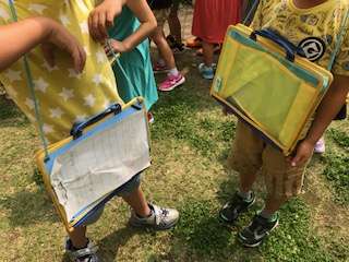 2年生が町たんけんに出かけます。記録する紙をバインダーにはさんで出発します。