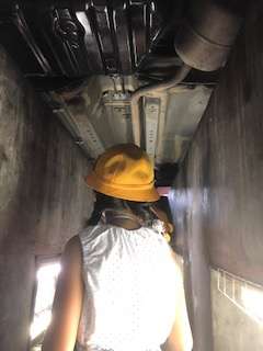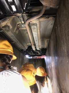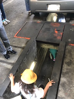 自動車修理工場では、修理で使う場所に入って自動車の真下を見せていただきました。