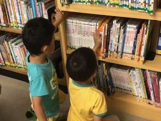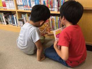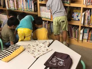 本を選んでいます。床がカーペット敷きなので座って選べます。
