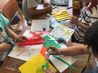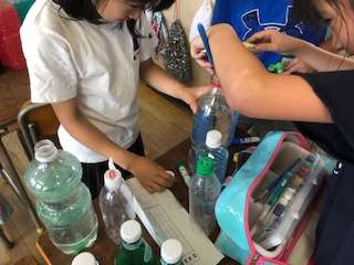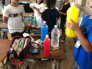 クラスごとにすることが違います。このクラスではボーリングをするのでペットボトルに色水を入れていました。部屋の飾りを作るグループもいました。