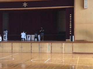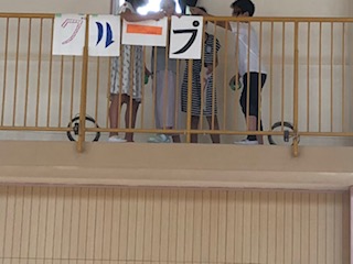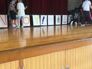 なかよし集会に向けて、全体会場の講堂でタイトルなどを代表委員が掲示しています。