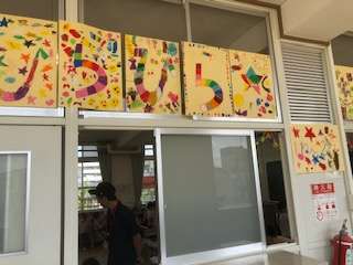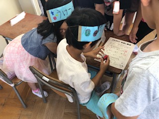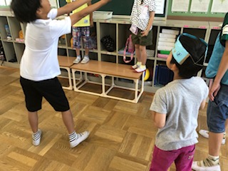 ひらひらきゃっち。紙を上から落としてそれを手で受け取るゲームです。紙の落ち方で取りやすさが左右されます。保護者の方の夢中になっておられました。