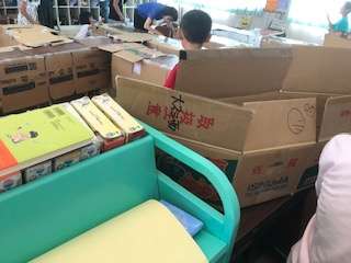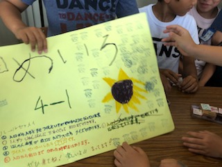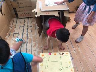 めいろ。 段ボールで囲われた机の下をもぐって進みます。出るのにとても苦労しているグループもありました。出てきた時はほっとした表情をしていました。
