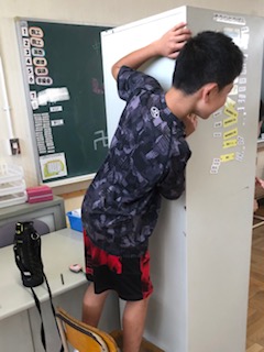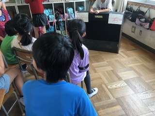 ひょっこりはんが右か左のどちらから出てくるのかを予想します。ひょっこりはんになっている子どもたちがとてもうれしそうです。