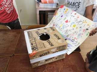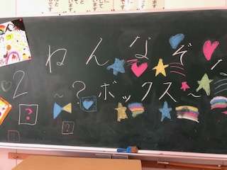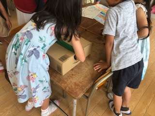 なぞなぞボックス。箱に入れた物をさわって当てます。さわるだけでは、くまとうさぎの違いなどがなかなかわかりませんでした。