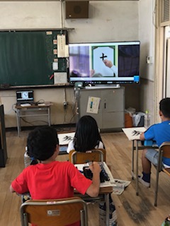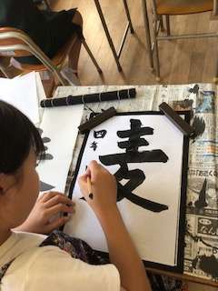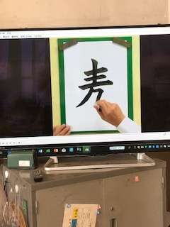 画面に写る手本を参考に麦の字を毛筆で書いています。