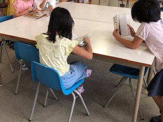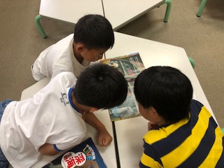 雨の日は休み時間に子どもたちがたくさん図書館に来ます。友だちと一緒に読んでいる子、一人で読む子など様々なスタイルで本に親しんでいます。