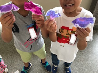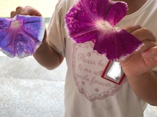 子どもたちが育てたあさがおも大きな花が咲き始めています。花を取ってこれからはがきにうつします。