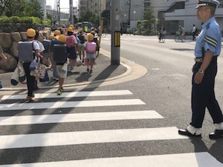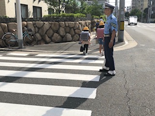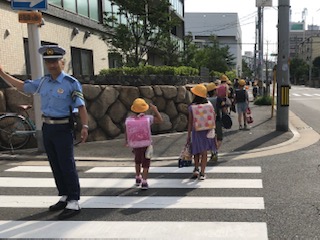 今朝は晴れて暑かったのですが、その中でも警察官が横断歩道で子どもたちを見守ってくださいました。ありがとうございます。