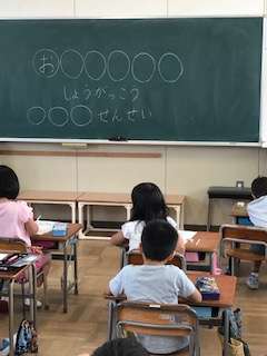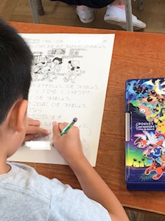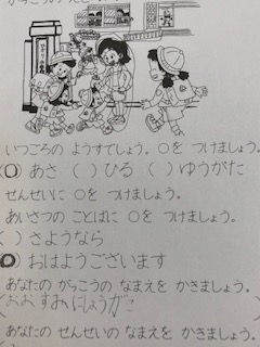 プリントの絵を見て、あいさつの言葉や自分の学校の名前などを書いていきます。