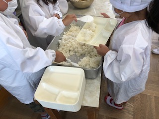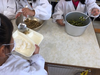 1年生がおかずを盛りつけて配っています。子どもたちだけで配膳がでけるようになりました。1学期の成長がうかがえます。