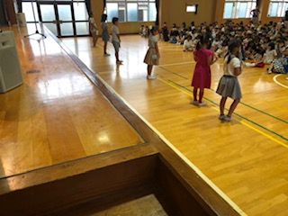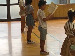 終業式の前に各学年の代表の子どもたちが1学期にがんばったことを発表しました。発表する子どもたちははっかりと読んでいました。聞いている子どもたちもしっかりと聞いていました。
