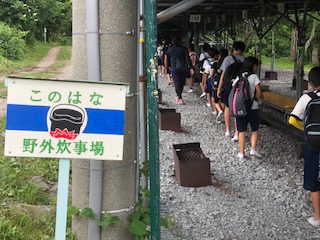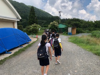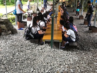 野外活動に行きます。魚つかみの仕方などの話を聞いています。