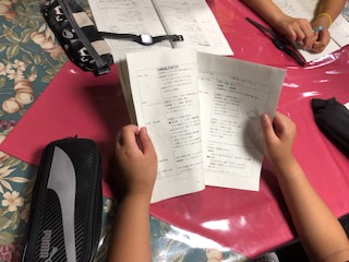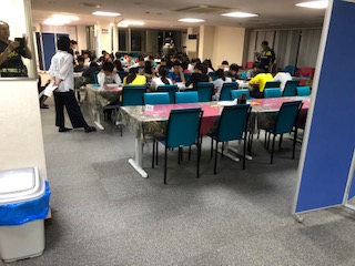 班ごとに座って林間指導の1日目の振り返りをしています。