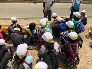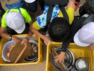 昼食の用意が活動班ごとに配られました。子どもたちで飯盒でのご飯作りとカレー作りをします。説明を聞いています。