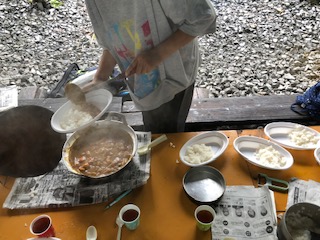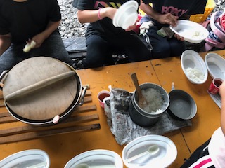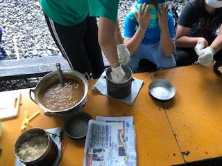 出来上がったご飯とカレーを食器に盛り付けていきます。