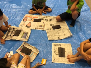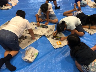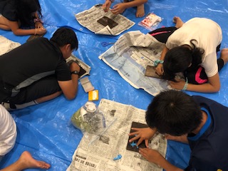 活動班ごとに輪になって絵付けをしています。デザインに悩んでいる児童は友だちと相談しながら楽しく活動しています。
