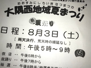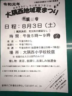 明日8月3日・土曜は大隅西地域夏まつりが大隅西小学校の校庭で行われます。