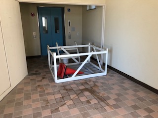 台風接近の情報を受けて校内の安全点検を行いました。朝会の台などを校舎の中に取り込みました。