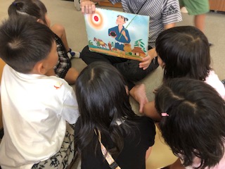 図書館では紙芝居を見たり、大きな絵本を読んだりして本に親しんでいます。