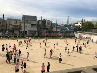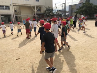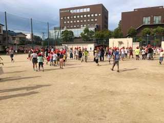 今日の児童集会は運動場で行いました。増え鬼タイプの鬼ごっこをしました。1年生から6年生までが楽しく遊びました。