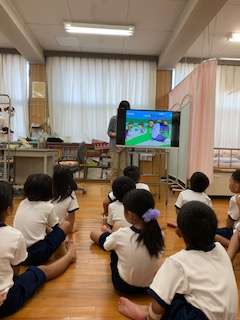 測定の前に紙芝居で睡眠についての、学習をしました。みんな真剣にお話を聞いています。