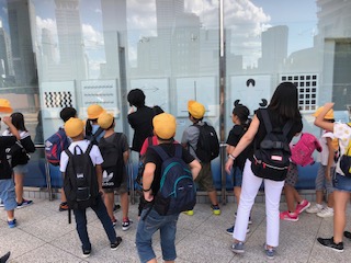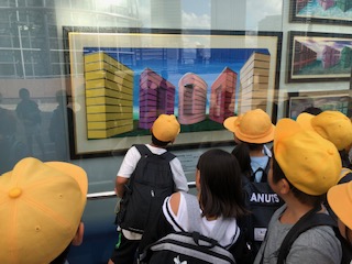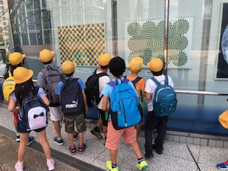 美術館の見学を終えて、科学館の前に戻ってきました。科学館の壁面にある不思議な絵を見て歓声を上げています。