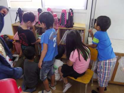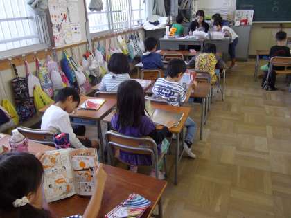 1年生の読書タイムの様子です。各学級に学級文庫を設置し、各学年に応じた本を用意しています。子どもたちは、図書室や学級文庫から好きな本を選んで読んでいます。