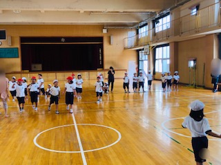 1年生はふれあい参観です。保護者といっしょにドッヂビーをします。子どもたちが保護者の方を呼んでいます。