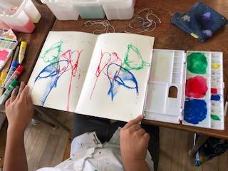 一つのクラスは図画工作で絵の具や用具を使って表現技法を学びました。