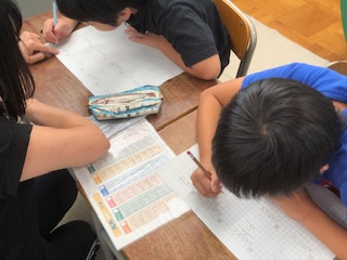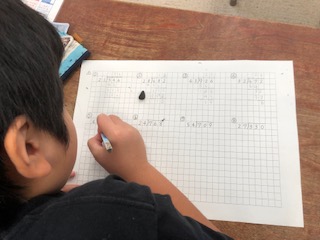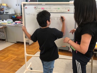 算数で345÷21などのわり算の学習をしています。この授業は公開授業として教員が参観して、授業力の向上を図っています。