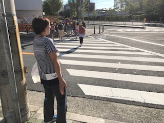 交通安全運動の週間には、地域、保護者、教職員も交差点などで子どもたちの交通安全のための活動を行っています。