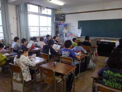 今日は読書タイムです。BGMとページをめくる音以外何も聞こえないほど、集中して読んでいます。また、物語や生物の本など関心がある本を選んで読むことができています。