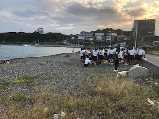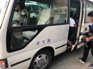 波が高いので当初の予定を変更して小型バスで漁港まで移動して地引き網をしました。
