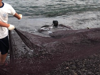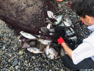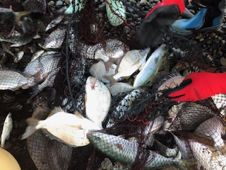 網が浜に上がってきました。網の中は魚でいっぱいです。大漁です。