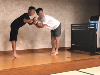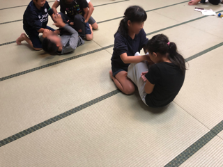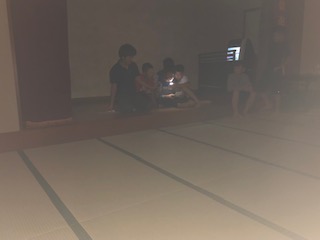 子どもたちが考えてきたプログラムでお楽しみタイムが進んでいきます。一発芸、腹筋、怪談話など盛りだくさんです。先生も参加して盛り上げています。