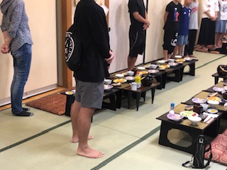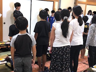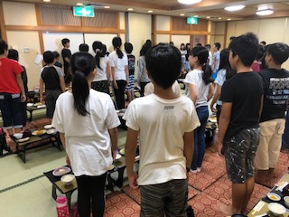 朝食の前に座敷で朝の会を行いました。元気いっぱいのおはようございますの声が部屋に響いて宿舎の方々も笑顔で見ておられました。