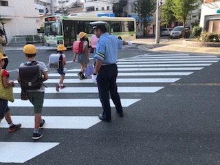 信号で子どもたちの安全な登校を見守っていただいています。(警察官の方の承諾を受けて掲載しています)