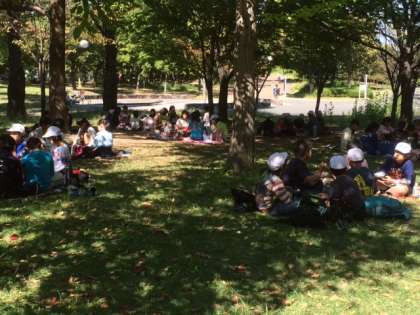 高学年のお昼ご飯です。木陰で食べている人が多いですね。下級生の人たちにいろいろ教えてあげたので疲れたかな?