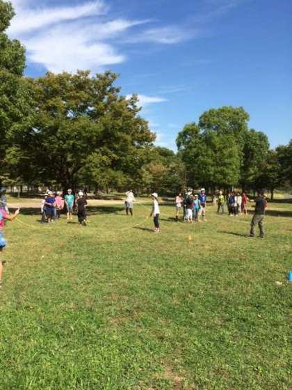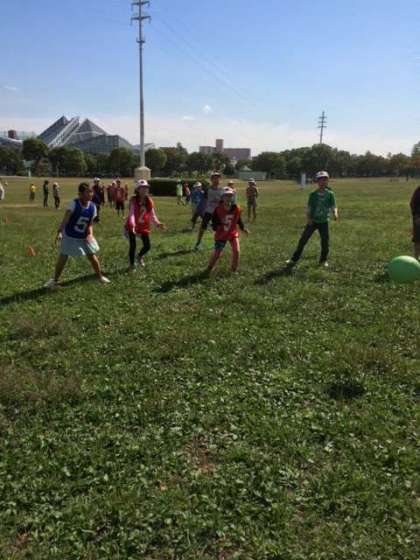 昼食後の自由時間の様子です。大なわをする人、ドッジボールをする人、鬼ごっこをする人、いろいろですね!