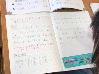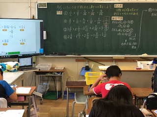 分数のたし算、ひき算を学習しています。ノートをていねいに書いている児童もみられました。