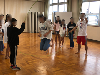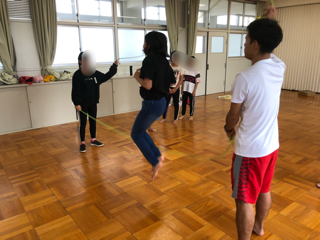 リズムよくダブルダッチにチャレンジしています。とてもうまくとんでいます。