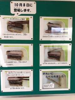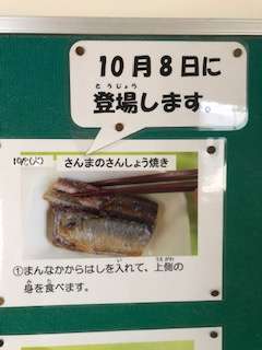 今日の給食では秋の味覚であるさんまのさんしよう焼きがでました。給食室横にはさんまの食べ方が掲示されています。