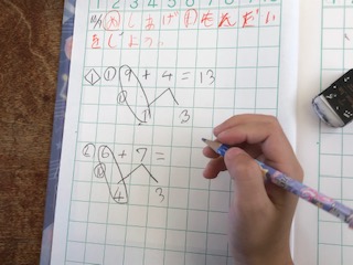 6たす7などの繰り上がりのあるたし算を学習しています。合わせて10になるようにしながら計算に取り組んでいます。