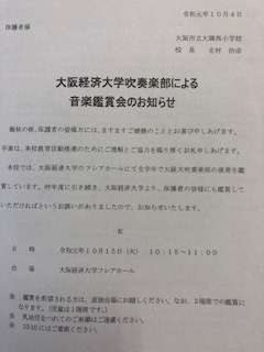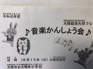 今日は音楽鑑賞会です。大阪経済大学フレアホールで行います。保護者の方も鑑賞できますので会場にお越しください。10時10分までにご着席ください。