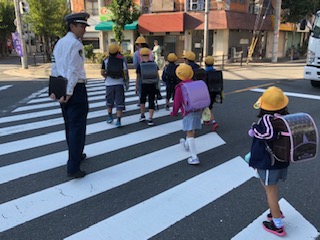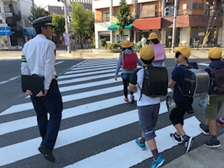 信号に警察官の方が立っておられます。子どもたちもおはようございますのあいさつをしています。