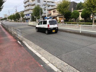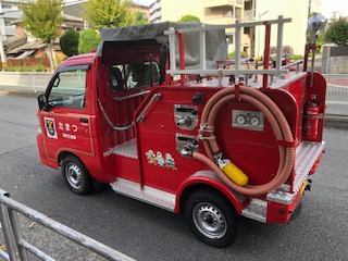 広報の青パトが今日の訓練をお知らせしています。消防車も到着しました。