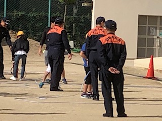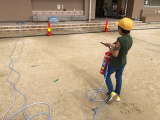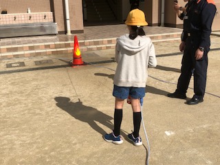 3年生と4年生が交代しながら水消火器を使って消火器の使い方を体験しました。