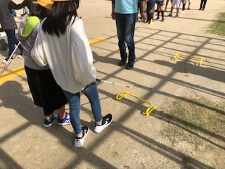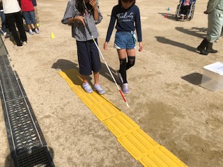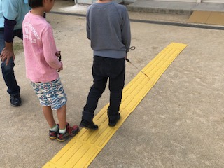 後半の4年生は運動場でアイマスク体験をしました。目が見えない方の誘導の仕方などを点字ブロックと白杖を使って学ぶました。