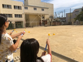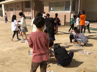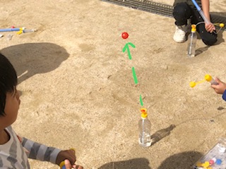 水鉄砲の原理を遊びながら理解していきます。水で赤いボールを押し上げました。